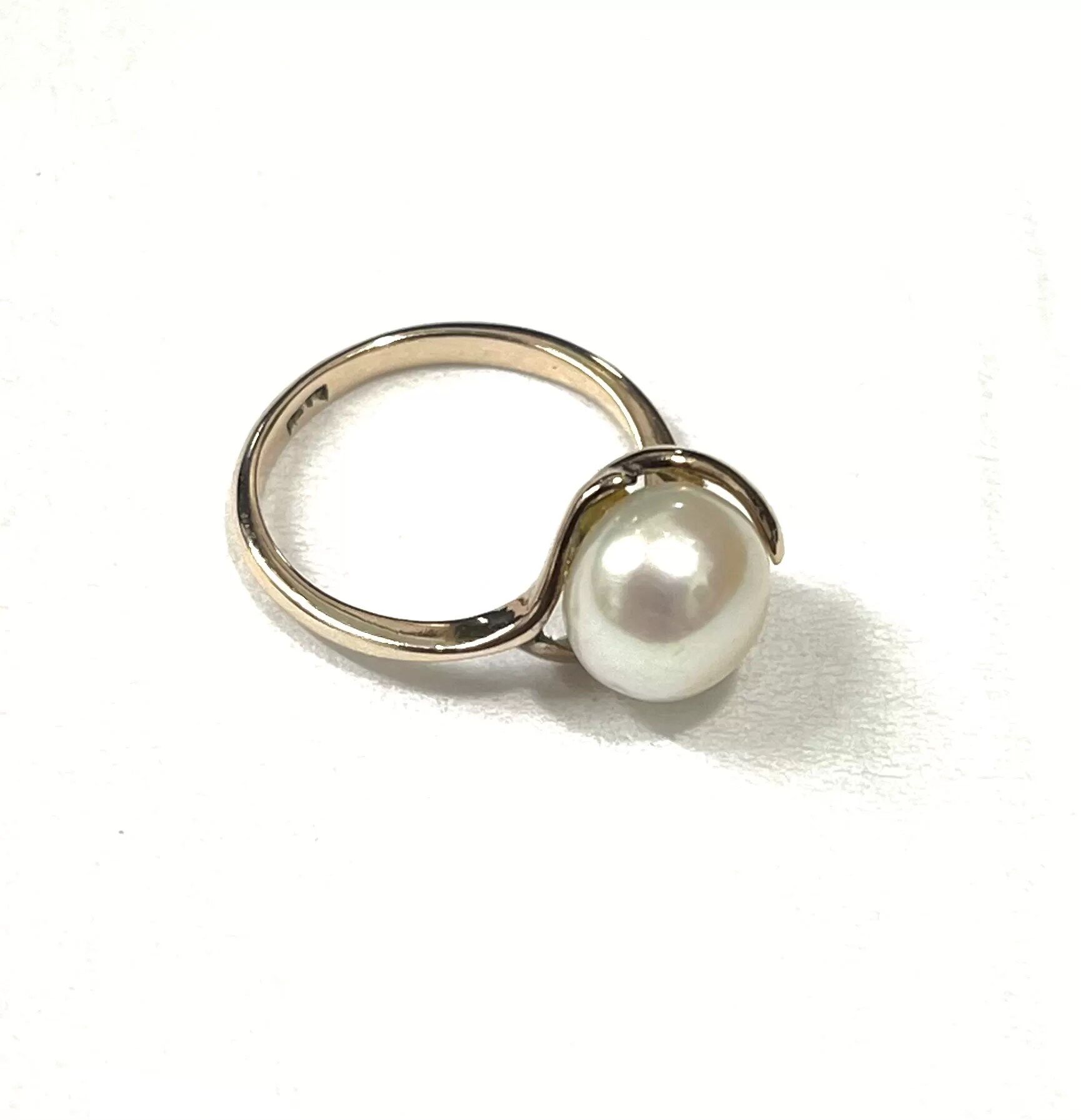 Yellow gold ring, unhallmarked but stamped ’14K’. The ring has been mounted with an 8.5mm cultured pearl, white in colour and displaying a bright lustre. Finger size: K. Ring weight: 2.5grams.