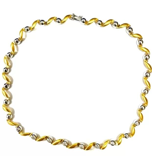 18ct yellow and white gold diamond collar, unhallmarked but stamped ‘750’. The wave pattern articulated collar has been mounted with nine round brilliant cut diamonds. Length: 17″. Weight: 43.8grams.
