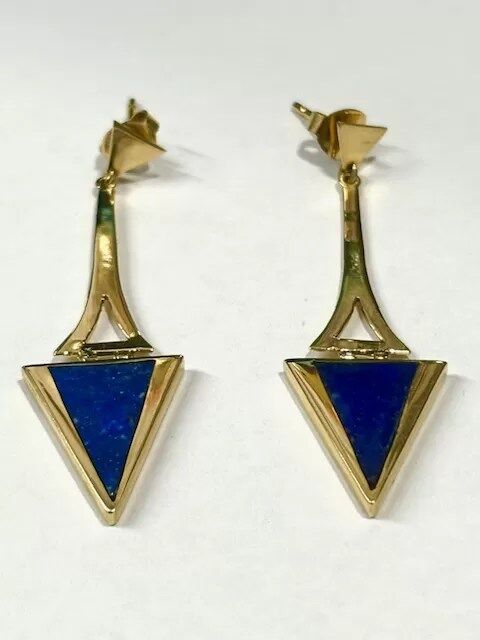 A pair of modern yellow gold drop earrings, stamped 18K. The earrings are of Art Deco arrow head design. Each drop has been mounted with Lapis Lazuli. Gross weight: 5.6grams.