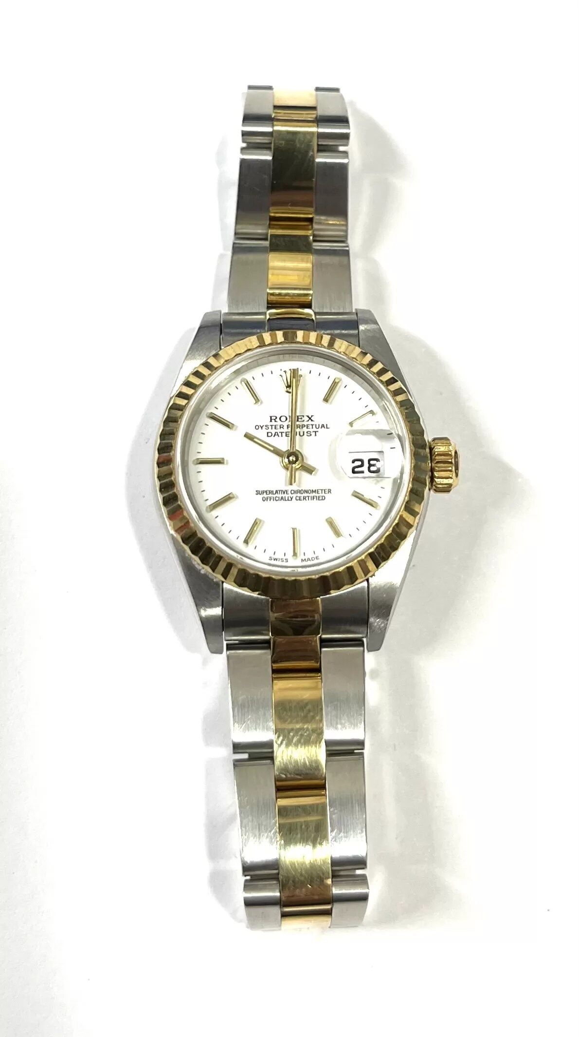 2001 Rolex Oyseter Perpetual Datejust. 26mm case. Stainless steel and 18ct Yellow Gold. Oyster Bracelet. White gold dial with gold coloured batons and hands. Mechanical movement. Model No: 79173. Box and Papers.