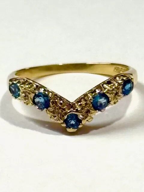 9ct yellow gold wishbone style ring. The ring has been mounted with five round faceted Topaz alternating with four ‘8’ cut diamonds.