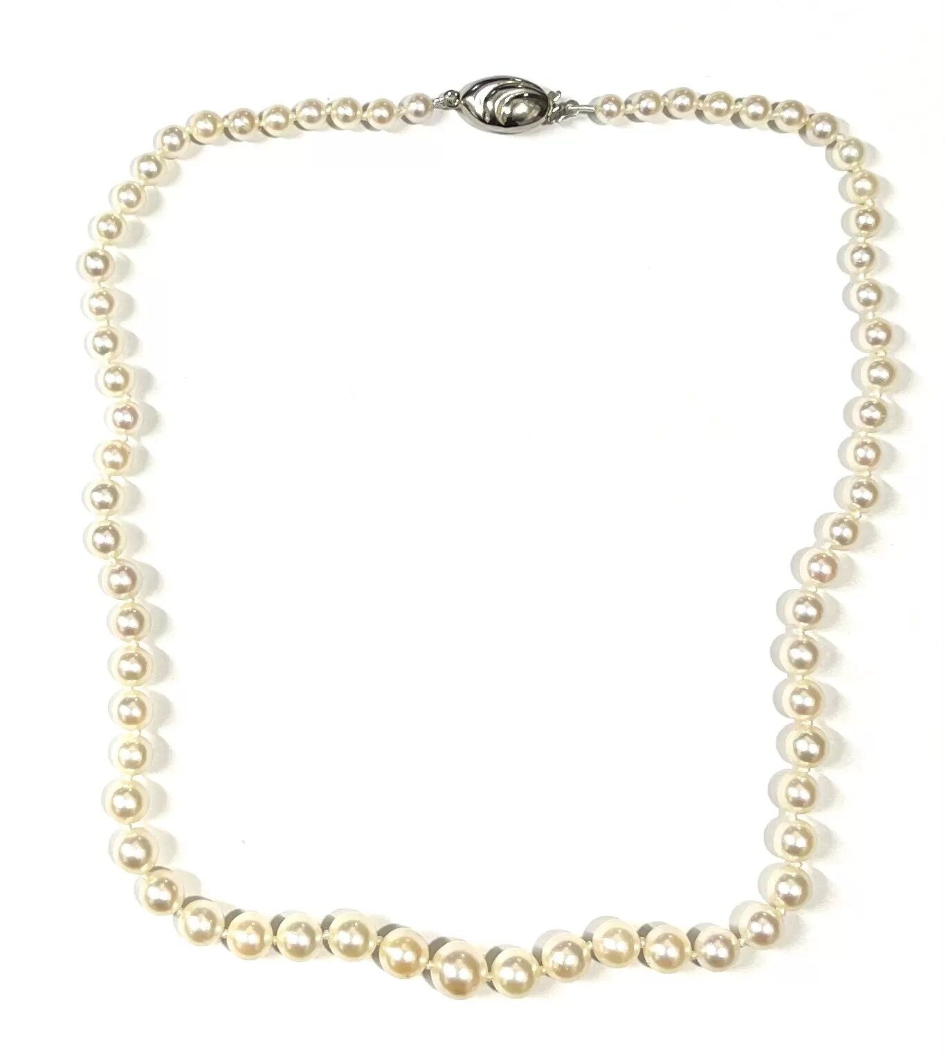 Cultured pearl necklace, strung with 65 cultured pearls, which graduate in size from 4mm – 8mm. 16.5 inches in length. The pearls have been strung on to an 18ct white gold clasp.