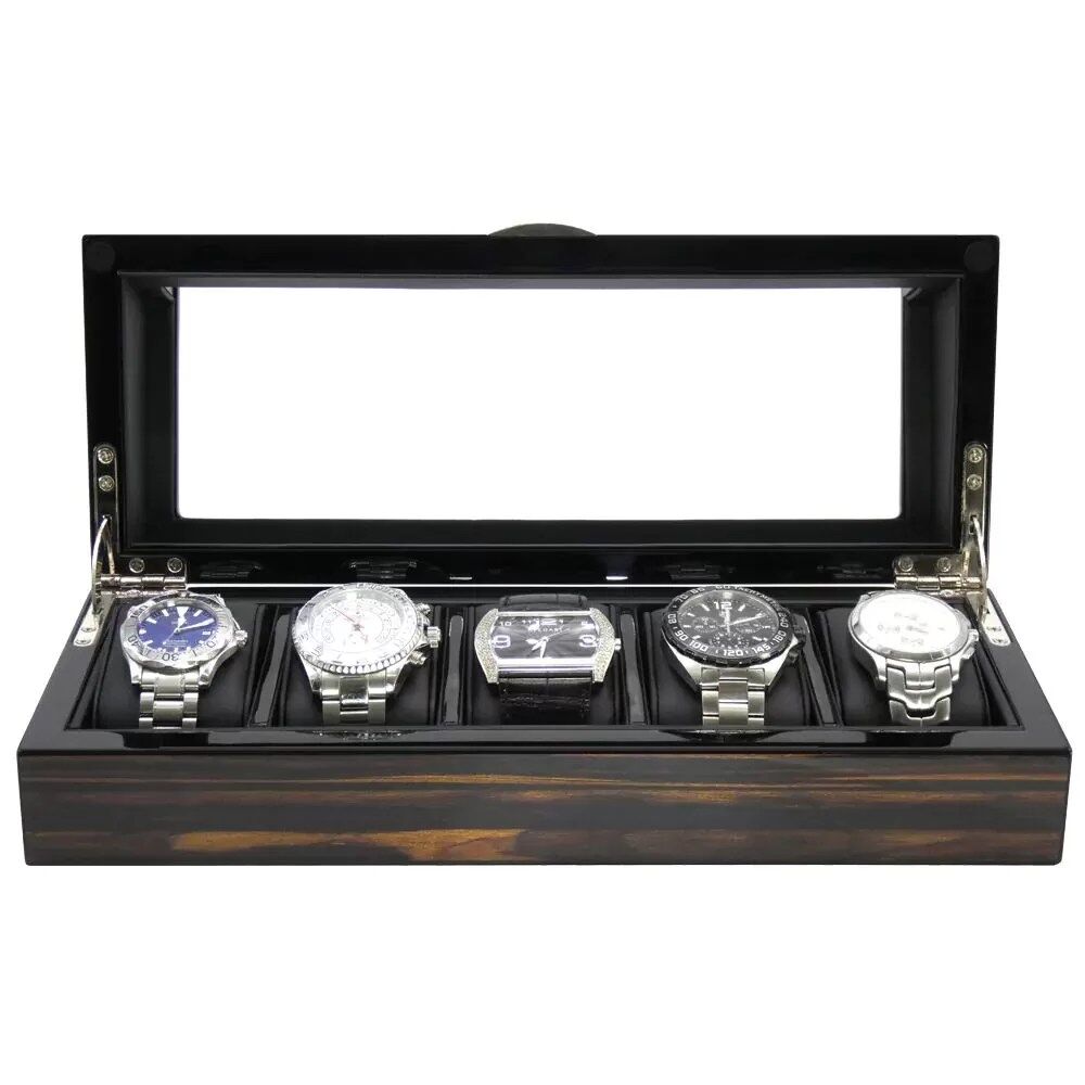 LUXURY 5 SLOT WOODEN WATCH CASE STORAGE BOX IN EBONY WOOD FINISH